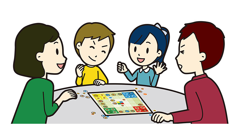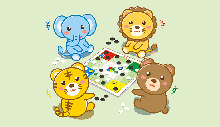 「4色碁石」は、黄・緑・赤・青の4人のプレ―ヤーが、空きマスに向けて、相手のコマを飛び越して取り合うゲームです。取って、取られて、取り返す…4人の間のかけひきと盤上を乱舞するスリリングなゲーム展開は、きっとアナタをとりこにするはずです。