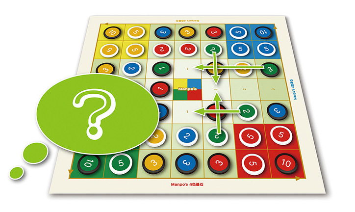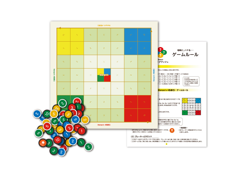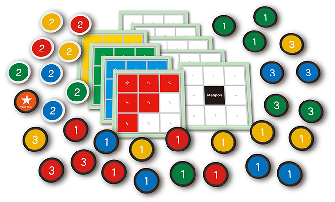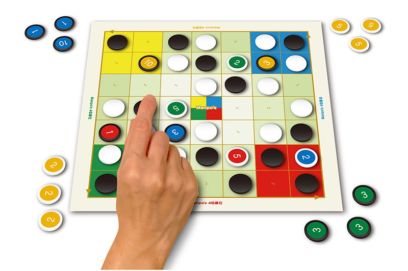 神経衰弱といえば古くさいゲームと思われそうですが、ひとひねりすれば、みんなでワイワイ楽しめるおしゃれなパーティゲームに変身します。「Manpo's脳みそクラッシュ」は、「4色碁石7×7」のコマとゲーム盤をそのまま使って楽しむ、3枚合わせの新型神経衰弱です。ゲームが進むにつれ、盤上に開いたコマがドンドン増えて、チャンスとピンチが拡がります。