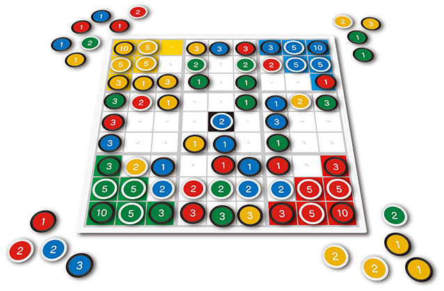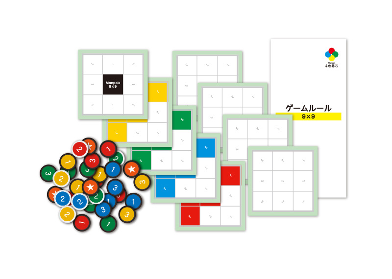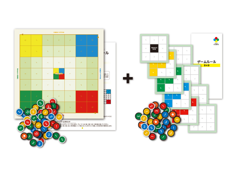 「拡張キット」は「Manpo's4色碁石」のオリジナルセットをそのまま活かして、盤面を9×9マスに拡げます。「拡張キット」には、3×3マスのボードシールと追加のコマおよび各色のコマシールが入っています。オリジナルのゲーム盤の裏側にボードシールを貼りつけ、9×9マスの盤面をつくります。次に、追加のコマを合わせて各色19個のコマを盤上に配置して、新戦場での戦いが始まります。