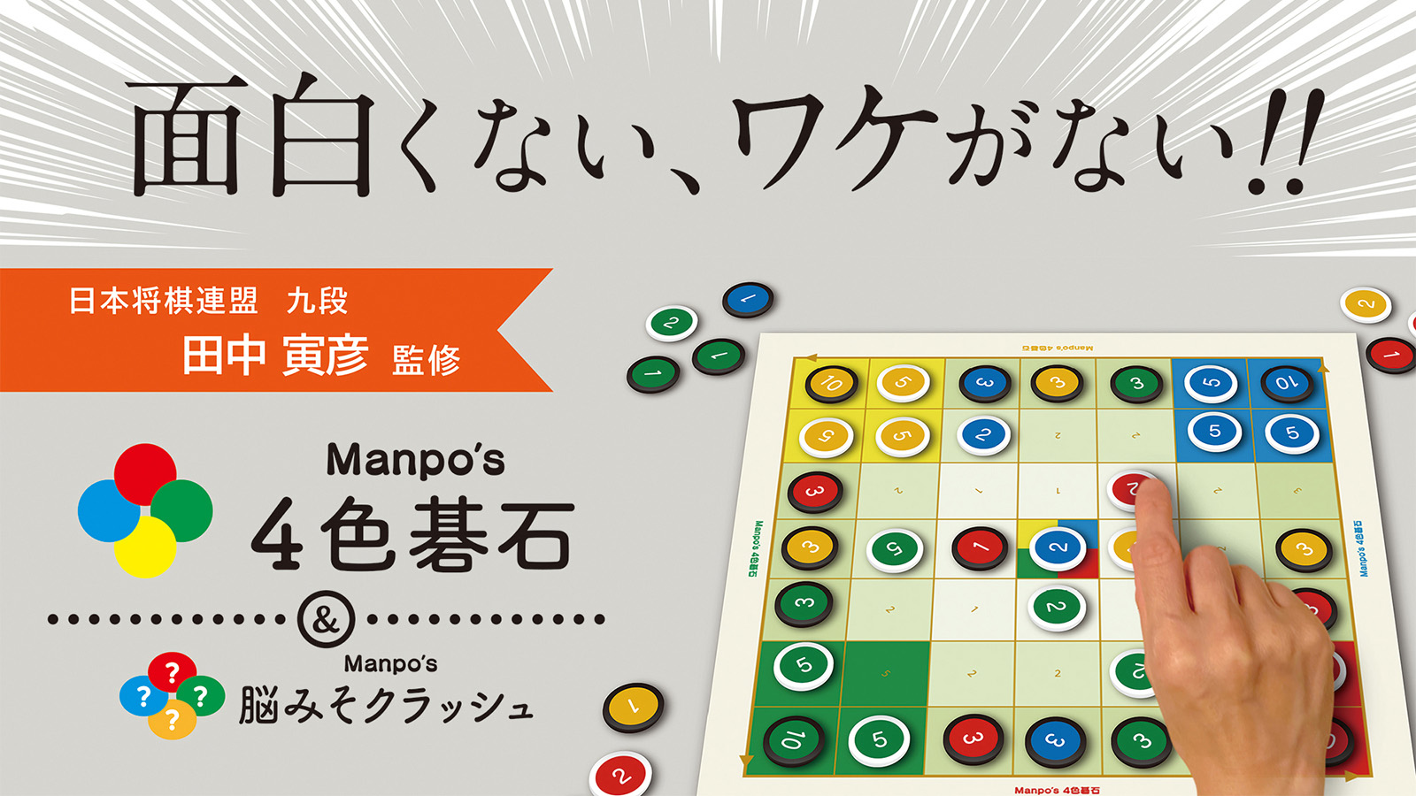 「Manpo's 4色碁石」は、『4人将棋』の考案者として知られる太田満保氏が、お孫さんたちのために創作されたゲームです。そのためルールもとてもシンプルで、誰でもすぐに覚えることができます。それでいて、監修にあたったプロ棋士の私も舌を巻くほど独創的で、しかもゲームとして高い完成度を持っていますから、おとなもこどももついついハマってしまいます。